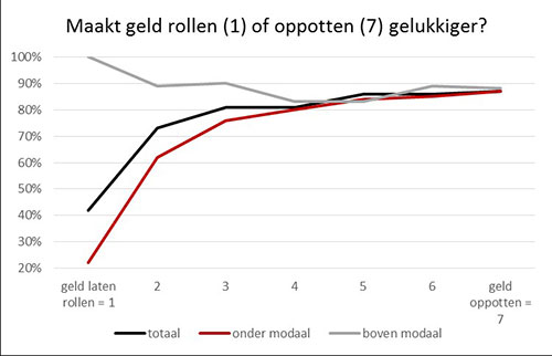 Ruim 2000 huishoudens werden ondervraagd in het DNB Household Survey van CentERdata. Op de vraag 'In hoeverre vindt u zichzelf een gelukkig mens' kon middels een aflopende 5-puntsschaal worden geantwoord. 'Gelukkig of zeer gelukkig' antwoorden maar liefst 85% van de ondervraagden. Die score varieerde echter tussen de verschillende inkomensgroepen. Voor huishoudens met een inkomen onder modaal was dit 83%. De laagste inkomens waren het minst gelukkig. Die geluksscore liep gestaag op tot maar liefst 92% onder huishoudens met een bruto inkomen tussen de 75 en 90 duizend euro per jaar, 2 tot 3 maal modaal. Dat bleek tevens de piek, want huishoudens die meer dan die 90 duizend euro verdienden, waren minder gelukkig. Hier bleek het gedoe en gedonder (bijvoorbeeld werkdruk, extra verantwoordelijkheden) zwaarder te wegen dan het extra inkomen bovenop die driemaal modaal. Maakt geld gelukkig? Ja, want naarmate je meer verdient, groeit de kans dat je je gelukkig of zelfs zeer gelukkig voelt. Maar de piek ligt net onder drie keer modaal. Nog meer verdienen, maakt niet gelukkiger.
