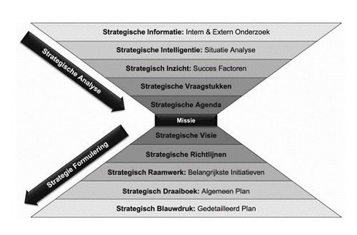 De rol van missie en visie in het strategieproces wordt duidelijk in het strategisch zandlopermodel. Dit model geeft de stappen weer waar een organisatie doorheen moet om tot een strategie te komen, en is tegelijkertijd een metafoor voor de hoeveelheid tijd per stap. Centraal in het model staat de missie, weergegeven als de nauwe ‘flessenhals’ waar alle strategische agenda-items doorheen moeten vloeien. In de metafoor van de zandloper symboliseert deze plek dat de strategische agenda door het ‘filter’ van de missie moet lopen, voordat men tot een visie komt waarop de verdere strategie kan worden gebaseerd.