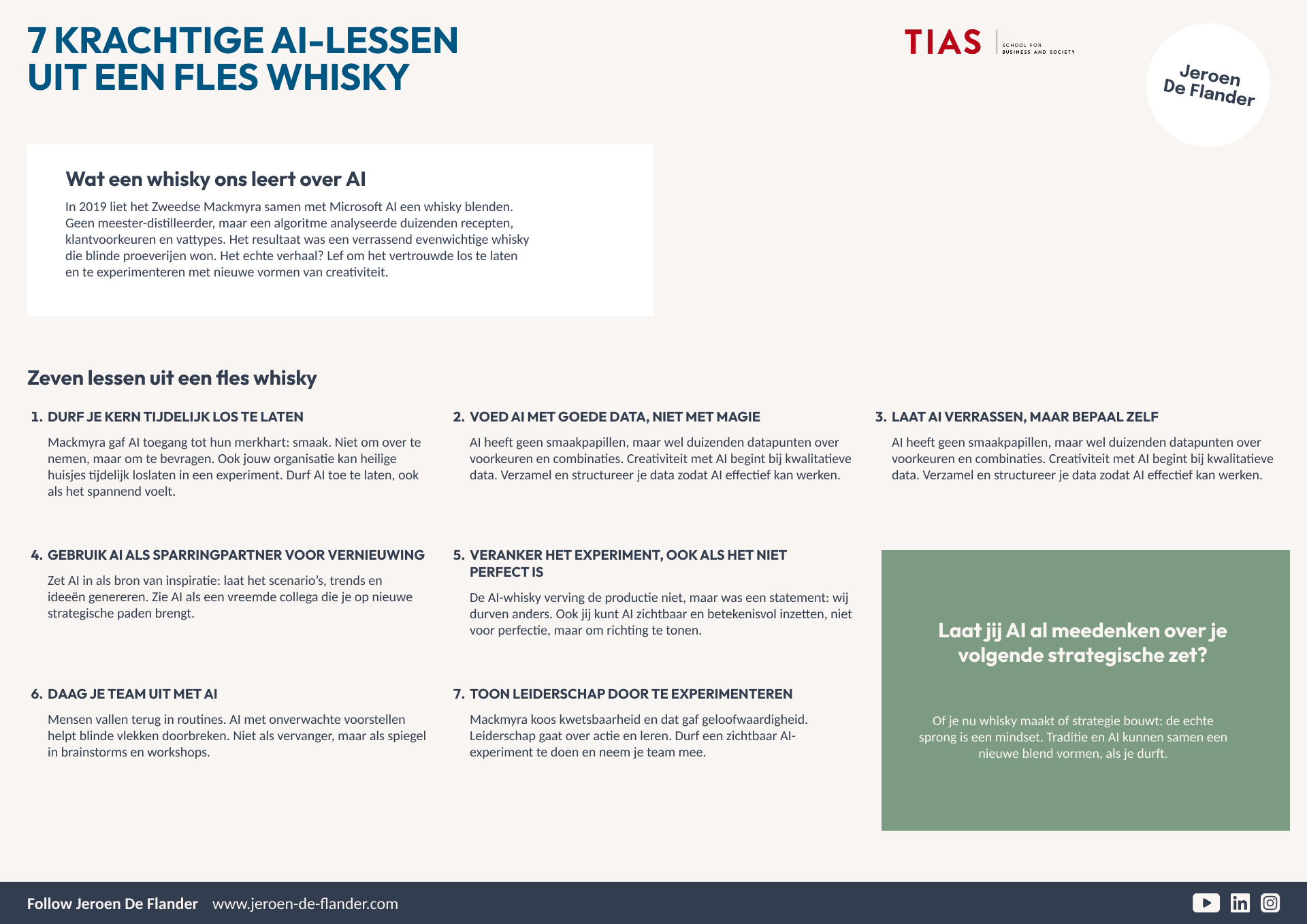 De AI-whisky was niet bedoeld om de hele productie te vervangen. Het was een statement, een signaal: wij durven iets anders. Ook jouw organisatie kan strategische statements maken met AI, door het expliciet toe te passen op een zichtbaar, betekenisvol domein. Niet omdat het perfect moet zijn, maar omdat het richting toont.