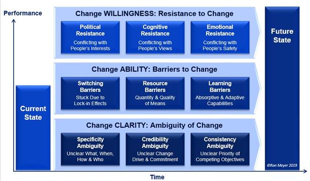 C. Learning barriers. Organization can also be lacking in their capability to absorb outside knowledge and adaptively figure things out along the way, making learning very difficult.Change willingness. Do all stakeholders actually want to realize the intended changes? Do they embrace the changes put forward and commit themselves to implementing them as intended, or are they reluctant, or even unwilling? Common reasons for resistance are: