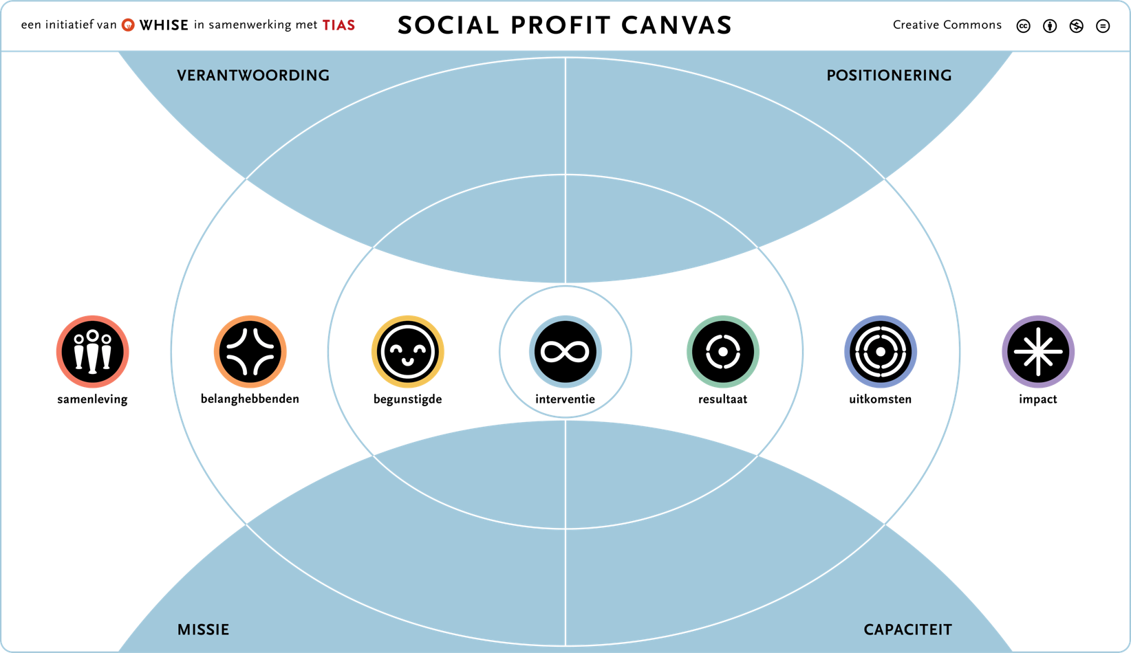 Als we nu een unieke gelegenheid krijgen om die publieke zaak opnieuw in de verf te zetten, dan is het cruciaal dat we van meet af aan glas helder zijn in de waardepropositie die non-profit en publieke organisaties doen aan de samenleving. Dat vergt nieuwe aanpakken bij zowel ontwerp, uitvoering als evaluatie. TIAS School for Business and Society en adviesbureau Whise hebben recent een methodiek ontwikkeld om die waardepropositie scherp te krijgen en zo beter te kunnen ontwerpen en bewaken. We hebben daarvoor aangesloten op enerzijds het denken van de Harvard politicoloog Mark Moore (Recognizing Public Value) en anderzijds op het Business Model Canvas van Alexander Osterwalder en Yves Pigneur. Dat resulteert in een ontwerp- en evaluatiemodel voor publieke initiatieven, het Social Profit Canvas. Onderstaand zijn de belangrijkste ingrediënten van dit model afgebeeld.