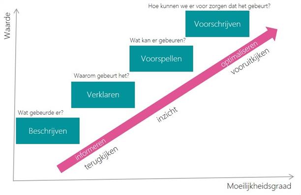 In theorie onderscheiden we vier stappen in data-analyse. Beschrijven, verklaren, voorspellen en voorschrijven. Elke stap is complexer en voegt meer waarde toe voor de beslisser. Veel toepassingen van data die we kennen in het vastgoedmanagement hebben betrekking op het beschrijven of verklaren van een situatie. Zo kunnen we met de huuradministratie beschrijven welke type huurders er wonen in onze complexen. We voeren bouwkundige inspecties uit waarmee we de conditie van onze woningen beschrijven. Een analyse van deze gegevens zou ons kunnen helpen te verklaren waarom bepaalde materiaaltoepassingen leiden tot intensiever onderhoud.